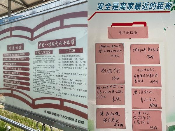 創(chuàng)新打造“廉建+”文化品牌,將廉潔教育融入項目日常。設立“清風宣傳欄”,定期更新中央紀委最新反腐動態(tài)、行業(yè)廉政新規(guī),配以簡明解讀,從“制度約束”到“價值認同”,以文化軟實力筑牢思想防線;建立“廉潔承諾墻”,上傳與家屬的合影,并將廉潔承諾手寫上墻,以“小家”撬動“大家”,用情感紐帶將“他律”轉化為“自律”。